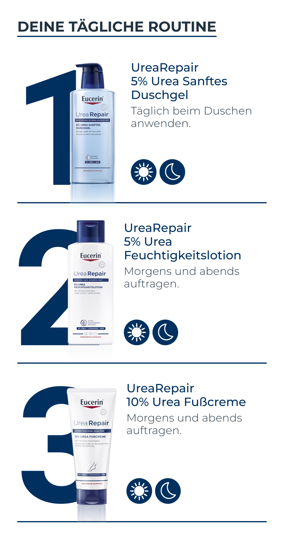 Die Eucerin UreaRepair Lotion 5% Feuchtigkeitslotion großflächig auf die trockene Haut auftragen und einmassieren, bis sie vollständig eingezogen ist.