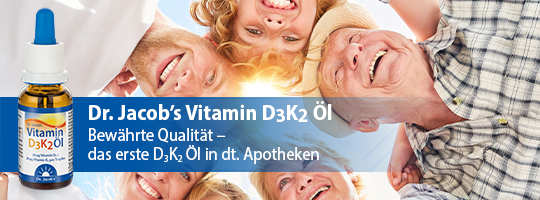 Schon 2015 brachte Dr. Jacob’s als erster Hersteller ein Vitamin D3K2 Öl in deutsche Apotheken. Bis heute wird Dr. Jacob’s Vitamin D3K2 Öl in Deutschland hergestellt. Die verwendeten Vitamine sind von Arzneibuchqualität und stammen aus Europa.