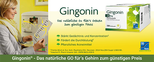 Gingonin® von TAD Pharma ist ein pflanzliches Arzneimittel mit dem Ginkgo biloba-Extrakt. Das Gedächtnis sowie die Leistung des Gehirns werden durch die Einnahme von Gingonin ebenso verbessert wie die Konzentration.¹ Das Gehirn wird kognitiv gestärkt und Durchblutungsstörungen wird entgegengewirkt.² Gingonin ist das einzige im Markt befindliche Ginkgo-Produkt in Kapselform mit den Wirkstärken 40 mg und 120 mg. Bei Vergesslichkeit und Konzentrationsschwäche¹ treffen Sie mit Gingonin die richtige Wahl, denn es steht für hohe Qualität zum günstigen Preis. Ginkgo-Extrakt wird im Allgemeinen aber auch bei Tinnitus bzw. Ohrgeräusche und bei Schwindel eingesetzt.³