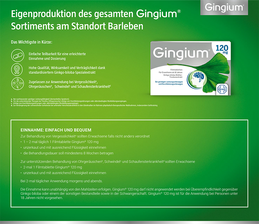 - Dank der hochkonzentrierten Kraft des Ginkgo ist Gingium® 120 mg pflanzlich wirksam und gut verträglich