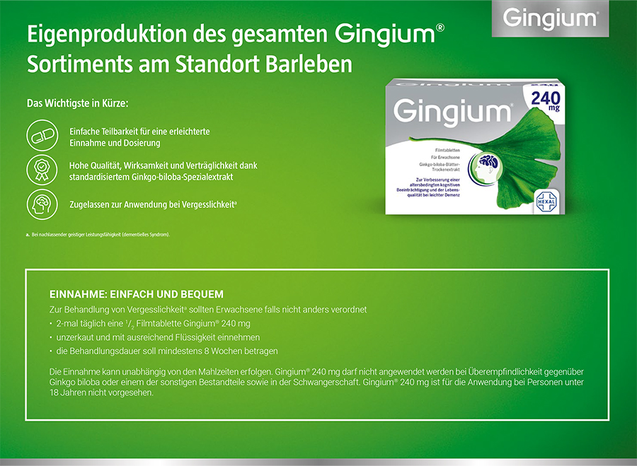 - Gingium® 240 mg verbessert Gedächtnis und Konzentration bei nachlassender geistiger Leistungsfähigkeita