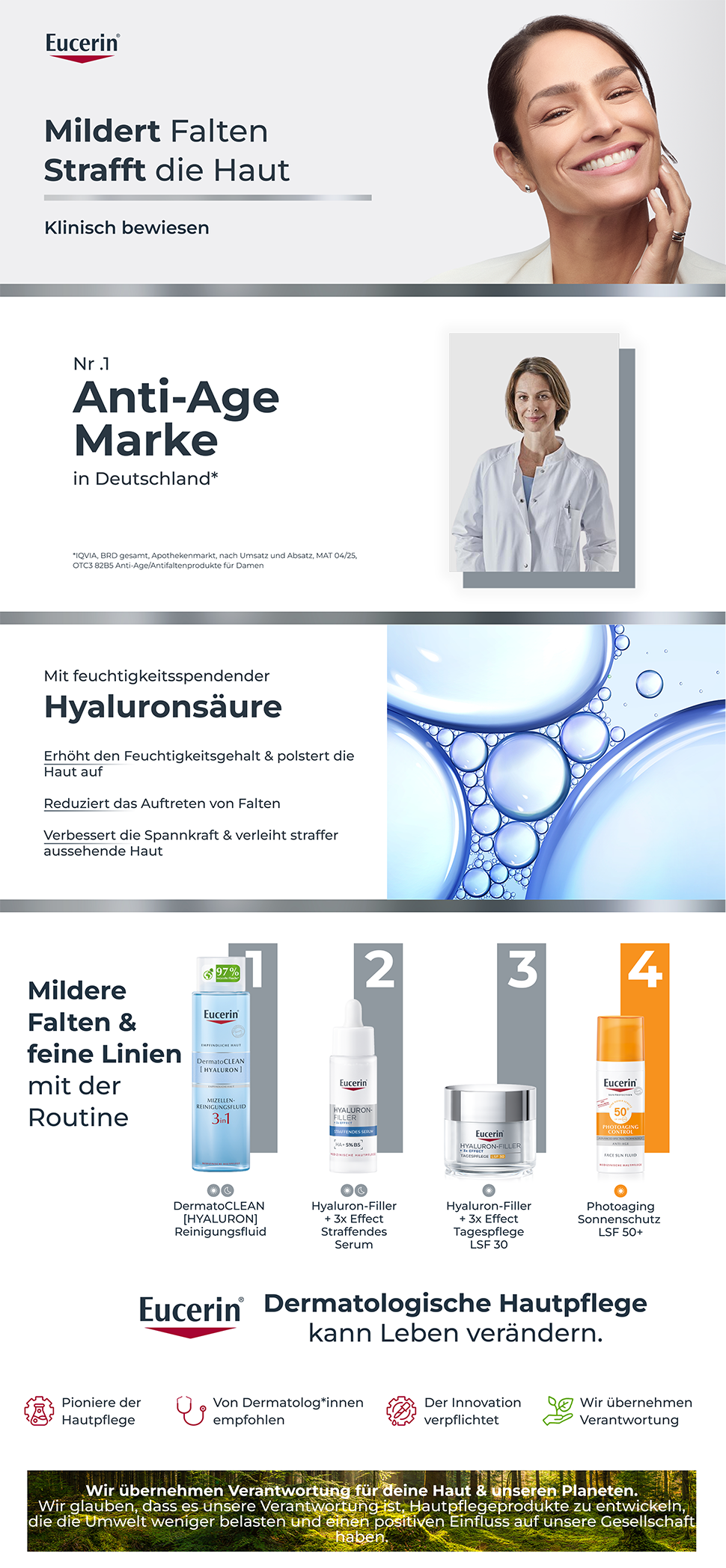 Die Eucerin® Hyaluron-Filler + 3x Effect Hyaluron-Intensiv-Maske ist eine erfrischende Tuchmaske zur intensiven Feuchtigkeitsversorgung und einen strahlenden Teint. In nur 5 Minuten spendet sie der Haut neue Frische und reduziert feine Fältchen sichtbar. Die innovative Formel mit hochkonzentrierter Hyaluronsäure ist für alle Hauttypen geeignet – auch bei empfindlicher Haut.