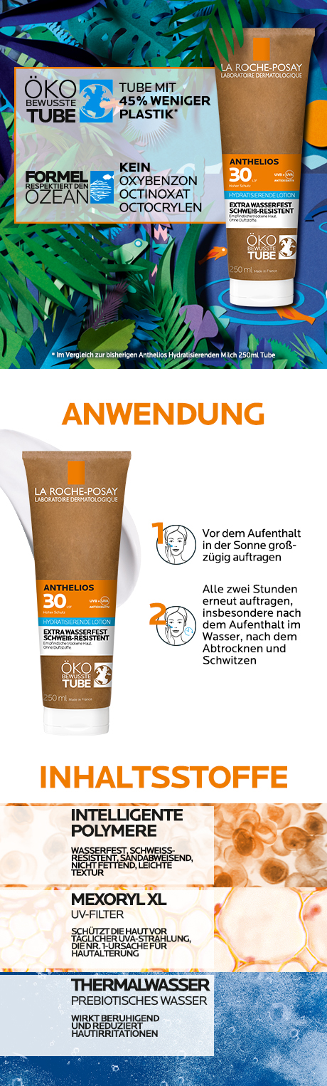 Die Anthelios Hydratisierende Milch LSF 30 bietet einen hohen UVA- & UVB-Schutz. Die samtige, nicht klebende und nicht weißelnde Textur lässt sich leicht auftragen und spendet dank Glycerin langanhaltend Feuchtigkeit. Zusätzlich enthält die Anthelios Hydratisierende Milch LSF 30 hautberuhigendes Thermalwasser aus La Roche-Posay.