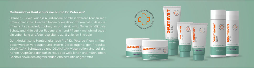 DEUMAVAN Waschlotion ist Teil der „Medizinischen Hautpflege nach Prof. Dr. Eiko Petersen“ und ist auf die Bedürfnisse sensibler Intimhaut abgestimmt.