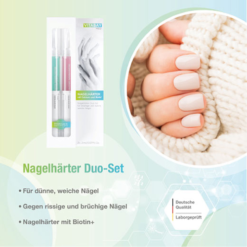 Das Set beinhaltet zwei Nagelhärter, die unterschiedliche Bedürfnisse erfüllen. Zum einen den Biotin+ Nagelhärter für brüchige und weiche Nägel. Zum anderen den Calcium Nagelhärter mit dem Wirkstoff Calcium Pantothenate für dünne und weiche Nägel.