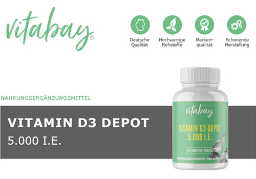 Um den Vitamin D3-Haushalt im Körper für längere Zeit mit hochwertigem, veganem Vitamin D3 zu versorgen, hat das Forschungsteam von Vitabay ein Produkt mit hochdosierten 5.000 I.E. konzipiert. Unser Vitamin D3-Depot 5.000 I.E. deckt einen Vitamin D3-Bedarf für ganze fünf Tage ab.